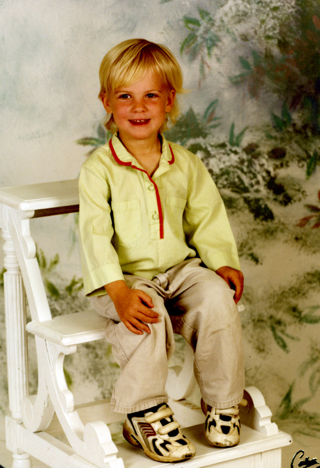 Compare this background with the one from last fall, with the lunch box and globe. The props in this pic are not quite elaborate, but I do like the scroll and column on the steps -- and the floral print behind him. Nice touch!