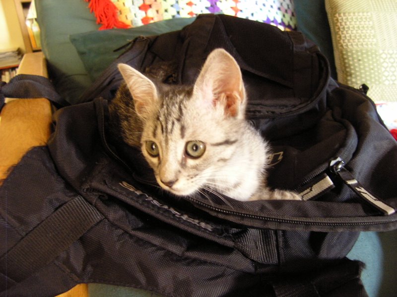 Fortunately, Jackson is a very friendly, sweet and calm kitten (for a kitten). She enjoys being around people and will often nestle up to Marysia while she's sitting on the couch. One day she even hopped in Marysia's backpack there.